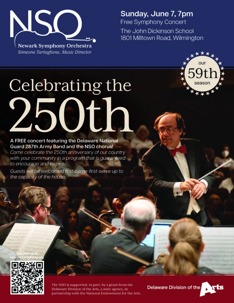 A FREE concert featuring the Delaware National Guard 287th Army Band and the NSO chorus! Come celebrate the 250th anniversary of our country with your community in a program that is guaranteed to encourage and inspire.